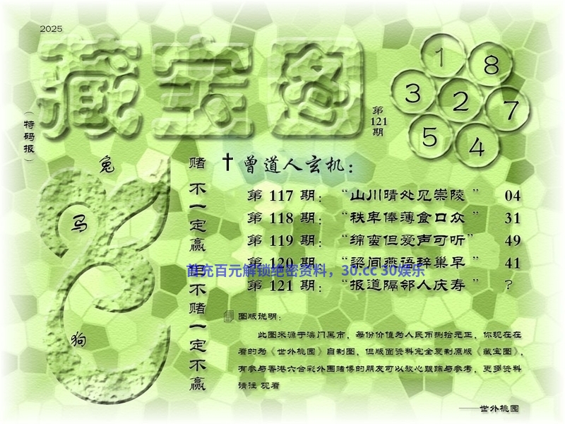 121期藏寶圖新:未知太保李公谁 老:起犯春霜壹泾寒 禁:马 禁:3尾 玄機字:《跃》